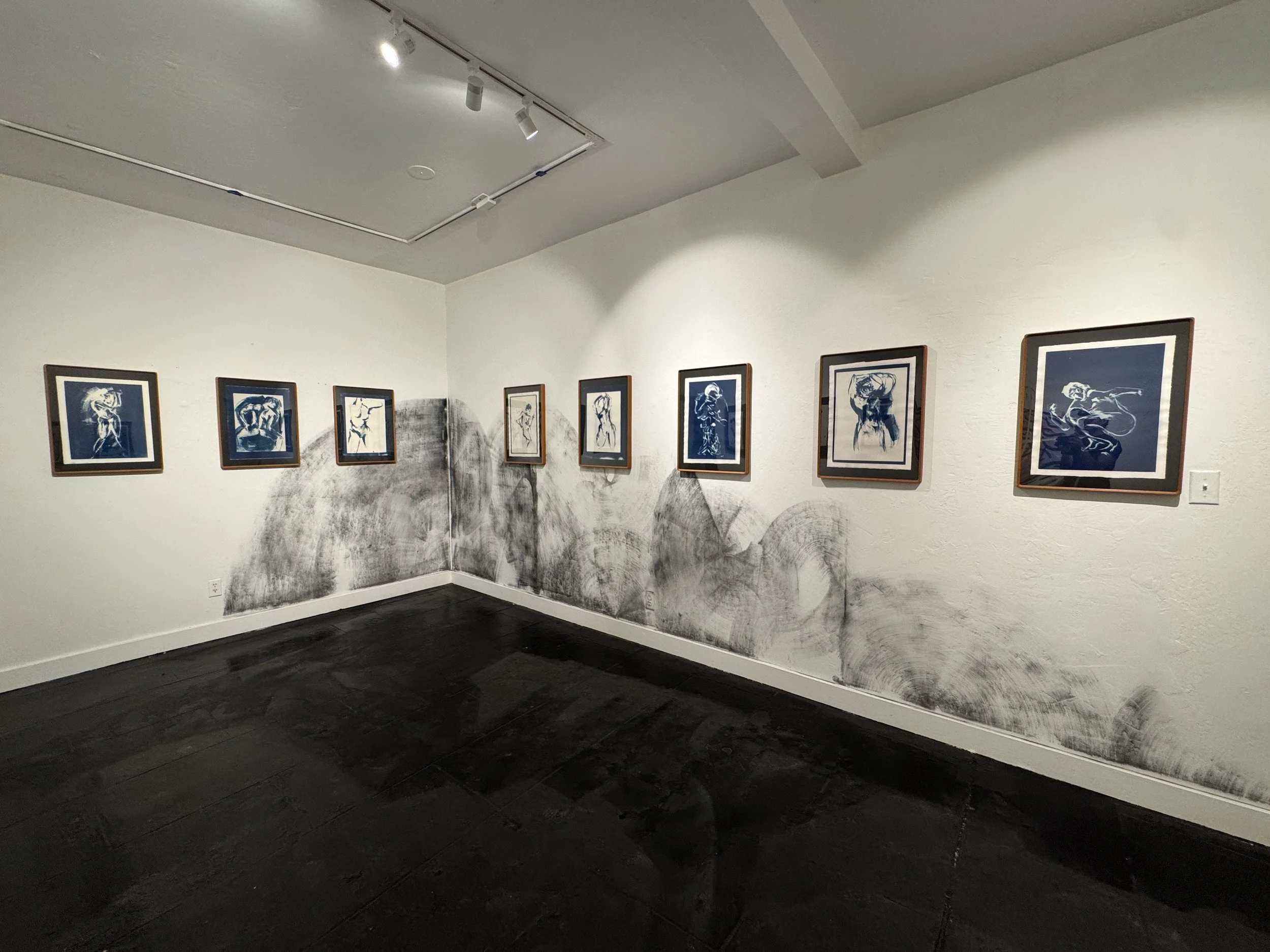 In this series of cyanotype works, Landeta uses their body as both site and material to investigate the complex relationships between queer and trans bodies and the systems of power that shape them. Each piece begins in solitude—dancing and moving through the studio space, allowing the body to find its own language of resistance, grief, intimacy, and empowerment. These movements are captured through gestural charcoal drawings, which become the foundation for unique cyanotype prints that transform ephemeral gesture into permanent archive.